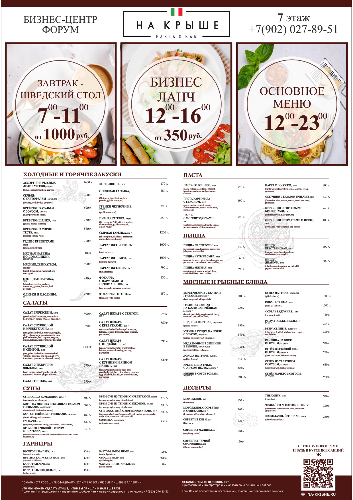 Завтраки с 07.00 до 11.00, Бизнес-ланчи с 12.00 до 16.00